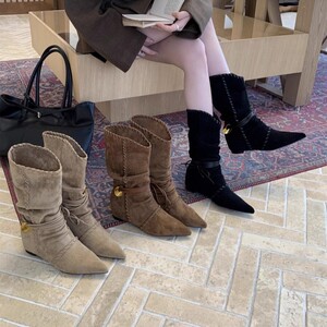 内增高尖头绒面瘦瘦中筒骑士靴女靴子2025秋冬季西部牛仔堆堆长靴