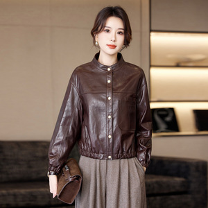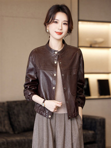 2025秋冬新款真皮绵羊皮短款时尚圆领宽松复古夹克皮衣机车外套女