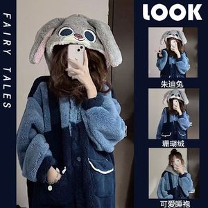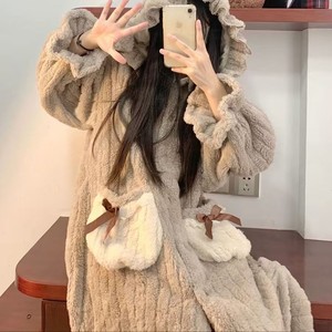 韩版棕色睡衣女冬季新款法兰绒加绒加厚长款连帽睡袍保暖居家服