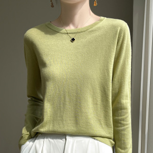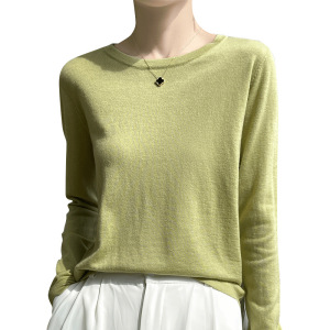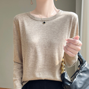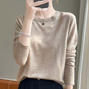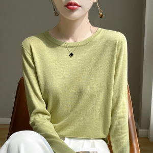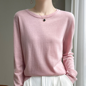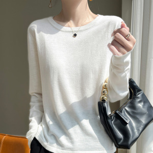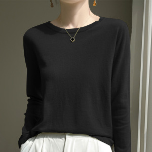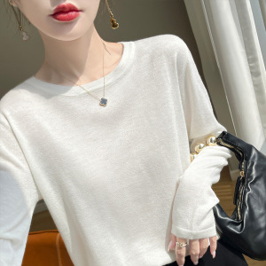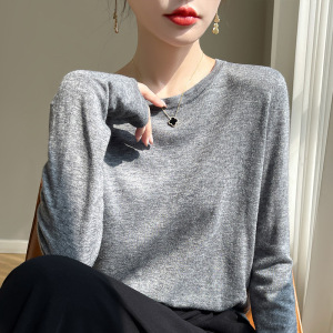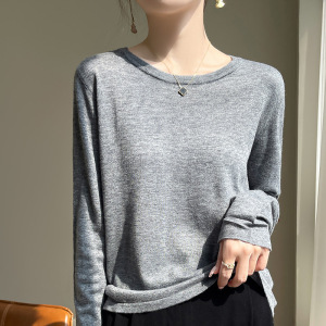 精纺细羊毛针织衫女圆领薄款春宽松长袖桑蚕丝T恤内搭打底衫上衣