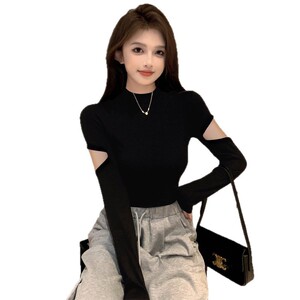 螺纹黑色半高领打底衫女春秋内搭设计感长袖t恤针织紧身短款上衣