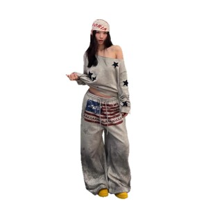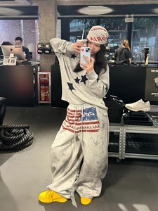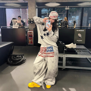 欧美hiphop字母印花运动卫裤女慵懒风做旧宽松百搭跳舞爵士弯刀裤