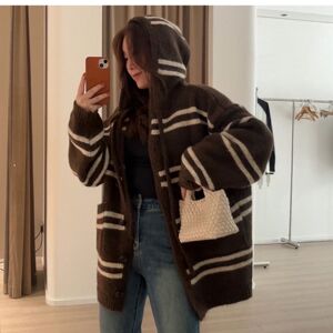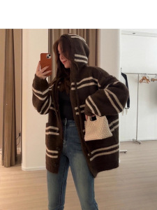 连帽条纹咖色针织开衫女秋冬韩系宽松慵懒风大码软糯毛衣外套上衣