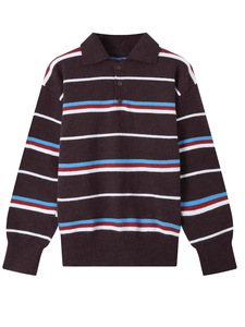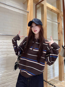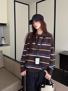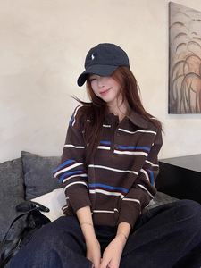 工厂现货韩系条纹针织衫撞色长袖polo领秋季设计感套头毛衣上衣女