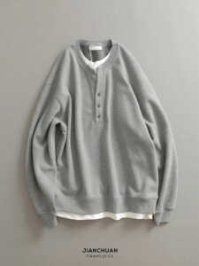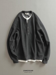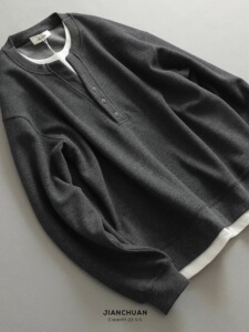 【见川】灰色桑蚕丝长袖上衣 cleanfit 假两件宽松磨毛V领卫衣 男