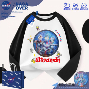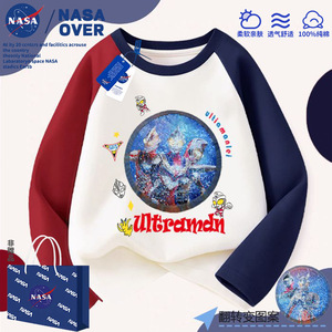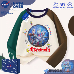 NASA奥特曼赛罗卡通亮片纯棉插肩长袖t恤秋季新款中大童百搭秋装