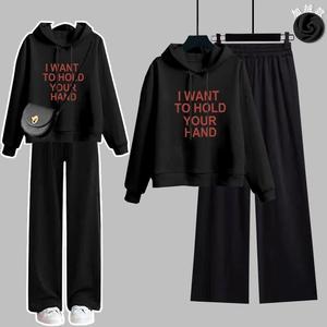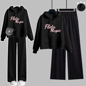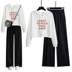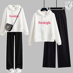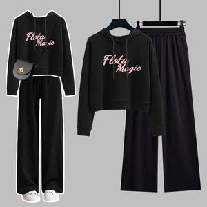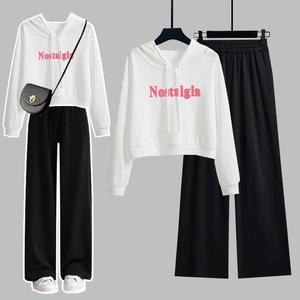 春秋新款时尚套装女宽松印花连帽短款卫衣+垂直感阔腿裤两件套潮