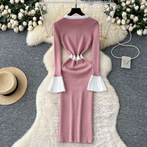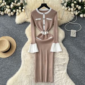 小香风高级感撞色喇叭袖针织连衣裙女秋装2025新款紧身包臀毛衣裙