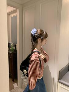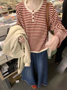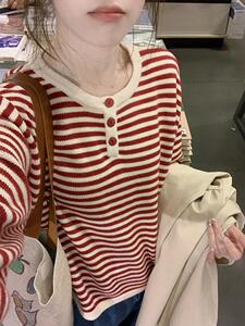 条纹yyds!巨显白日系撞色红条纹宽松慵懒风针织衫圆领打底上衣女