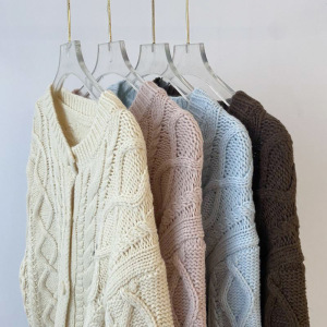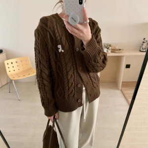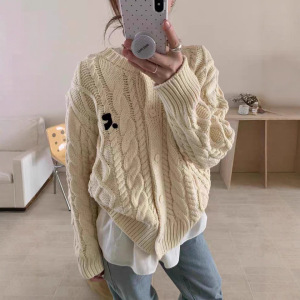 韩国小众!2025秋冬粗织麻花设计字母刺绣百搭纯色圆领毛衣外套女