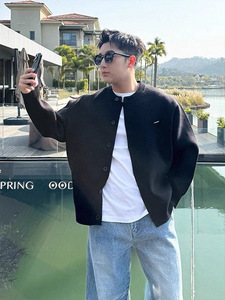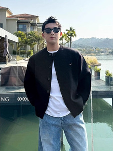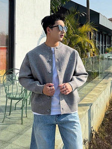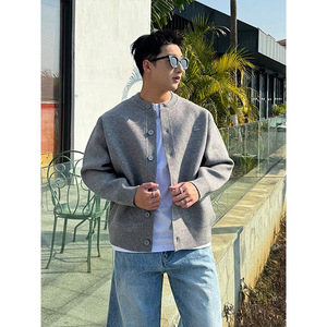 浅灰色棒球领毛衣开衫外套男秋天穿搭高级感痞帅宽松慵懒感针织衫