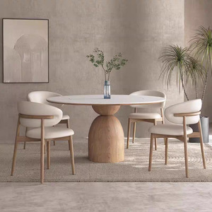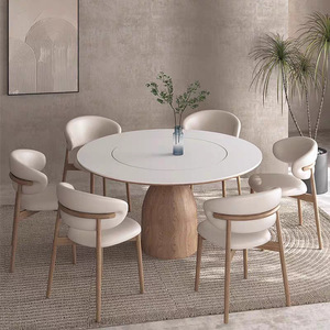 奶油风原木色内旋转岩板圆形餐桌带转盘白色饭桌侘寂风日式圆桌