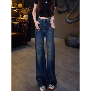 蓝色提花牛仔裤女2025秋季新款百搭时尚通勤减龄显瘦气质阔腿裤子