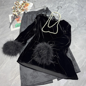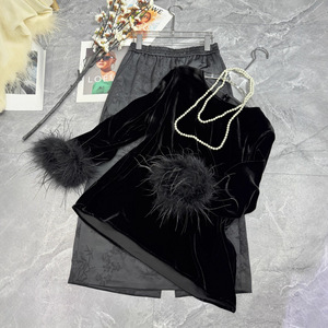 篙品质真丝丝绒黑色衬衫女2025秋季新品设计小众鸵鸟毛长袖上衣女