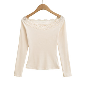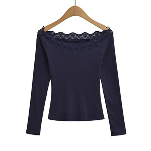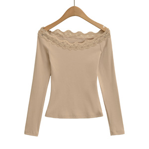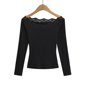 一字领长袖T桖女25秋季新款美式辣妹蕾丝拼接修身露肩打底衫上衣