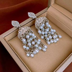 2#银针-金色镶钻珍珠方形花朵流苏耳钉