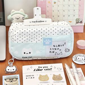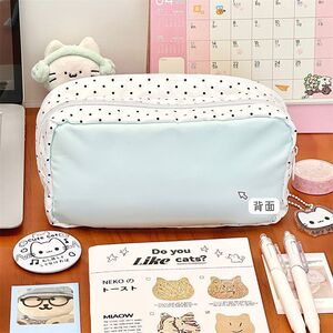 高颜值ins小红书同款薄荷波点小猫多层笔袋大容量铅笔文具袋百搭