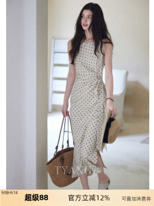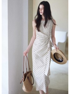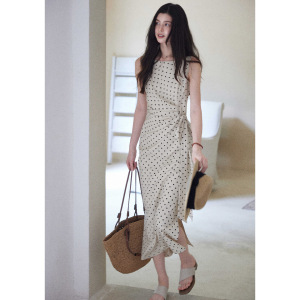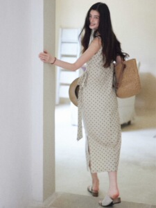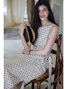贰羊设计【松间月】高级感气质波点连衣裙女侧收腰亚麻棉法式长裙
