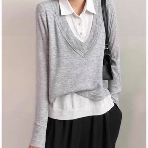 假两件~显瘦设计感针织衫 柔软亲肤细羊毛v领翻领长袖拼接毛衣秋