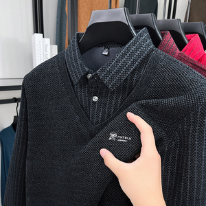 跨境男士假两件翻领加厚毛衣冬季新款保暖中青年打底针织衫上衣