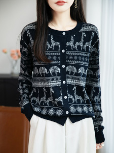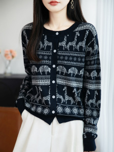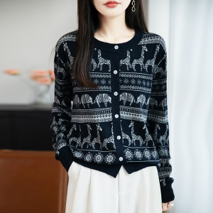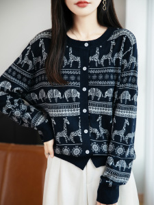 2025年早秋新款复古精纺羊毛圆领针织开衫长袖女动物提花宽松上衣