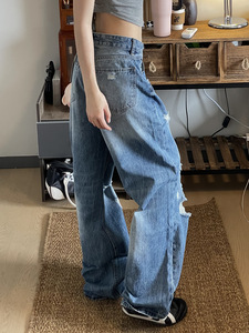 美式复古水洗做旧乞丐破洞牛仔裤女春秋新款宽松直筒阔腿拖地长裤
