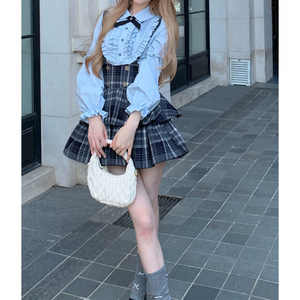 蓝调时光 学院风减龄花边衬衫上衣+收腰格纹背带裙套装秋2025新品