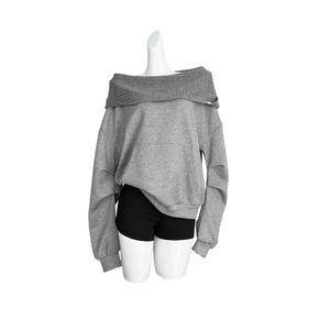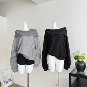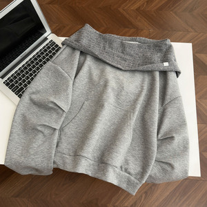 2025实拍秋季新款斜肩一字领宽松套头连帽卫衣露肩上衣女
