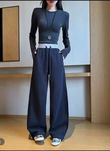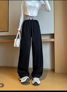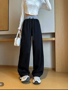 拼色卫裤女秋冬5新百搭垂感显瘦运动裤撞色腰直筒休闲弯刀阔腿裤