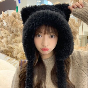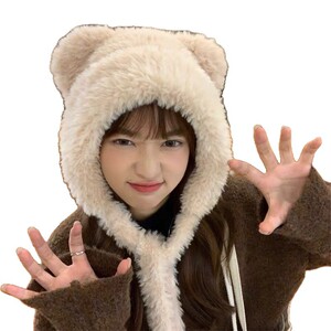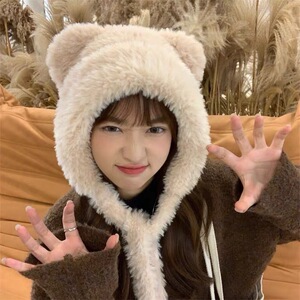 可爱小熊毛绒帽子女秋冬季2025新款大头围毛线帽护耳针织帽显脸小