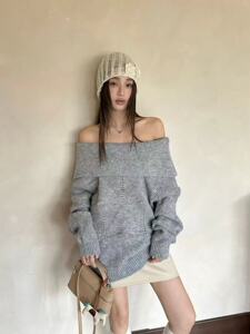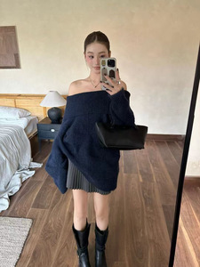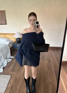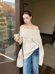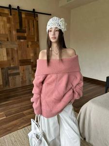 秋冬氛围感一字肩毛衣女露肩美学系列法式镂空套头针织衫大码女装