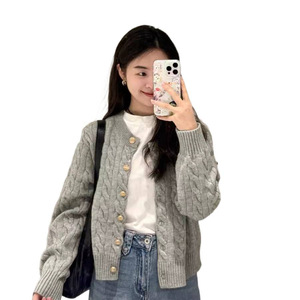 灰色麻花毛衣外套女春秋季2025新款感慵懒风短款针织开衫上衣