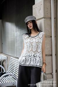 波浪法式秋季新款宽松蕾丝镂空圆领针织无袖上衣背心