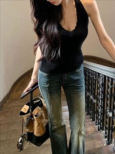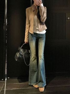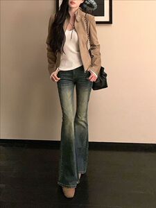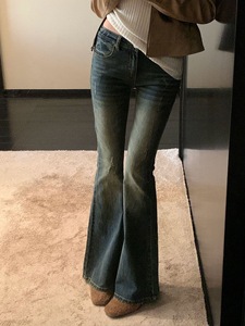 晨曦 复古蓝水洗做旧低腰微喇牛仔裤2025新款修身显瘦弹力裤子