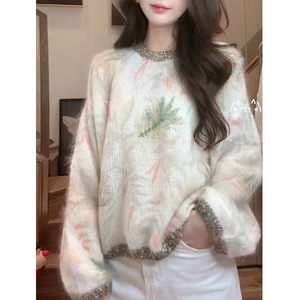 重工钉珠韩系晕染圆领毛衣女春秋新款宽松慵懒风软糯针织衫上衣