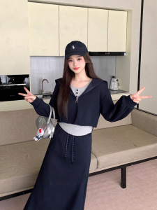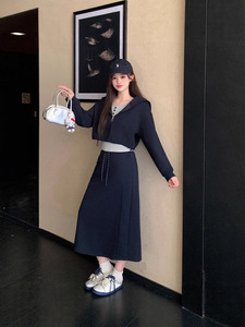 大码女装胖MM时尚减龄海军领半拉链卫衣背心半身裙三件套装