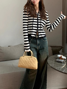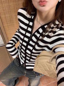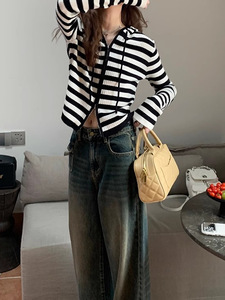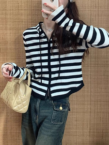 i向 法式松弛感 经典条纹连帽针织拉链开衫女毛衣外套