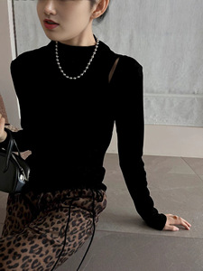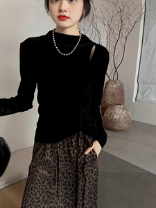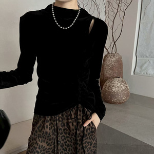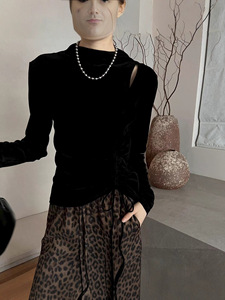 设计感小众抽绳收腰丝绒上衣女2025秋季新款露肩镂空打底衫T恤潮