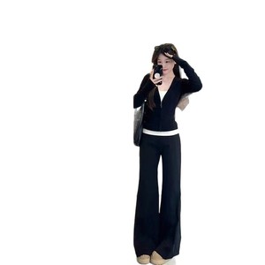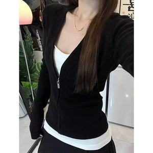 跨境批发秋冬随心裁撞色假两件拉链长袖t恤女式气质修身显瘦上衣