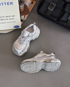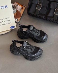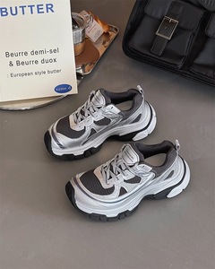 厚底真皮老爹鞋女2025秋季新款小个子增高拼色网面透气休闲运动鞋