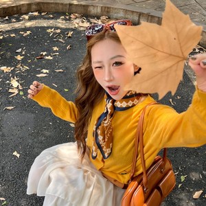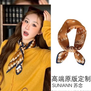 文艺复古系脖小方巾小众设计感腰果花丝巾个性气质橘黄色配饰女款