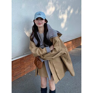 2025秋季高级感格子拼接两穿工装大衣休闲宽松连帽风衣外套松弛感
