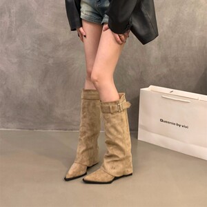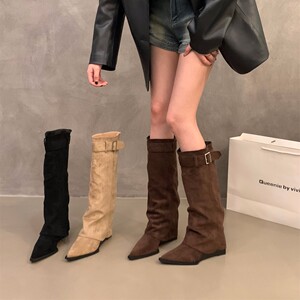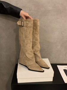 坡跟高跟尖头绒面堆堆靴中筒骑士靴女鞋2025冬季瘦瘦长筒长靴子