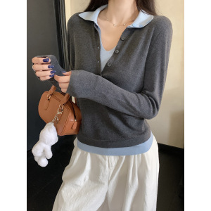 好物2025秋季韩版撞色假两件安迪绒polo领纽扣长袖针织衫毛衣女装