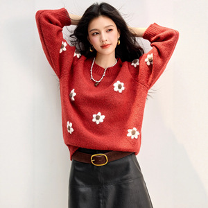 新年红色毛衣女长袖2025新款冬季法式小香风立体花宽松针织衫上衣
