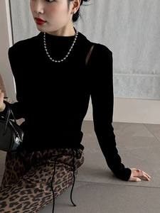 设计感小众抽绳收腰丝绒上衣女2025秋季新款露肩镂空打底衫T恤潮