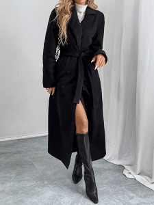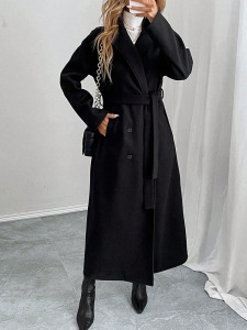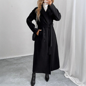 跨境黑色通勤呢大衣2025年秋冬新款欧美宽松中长款系带毛呢外套女
