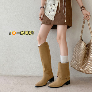 2025年新款粗跟尖头不过膝长筒靴女磨砂百搭复古优雅直筒靴瘦瘦靴