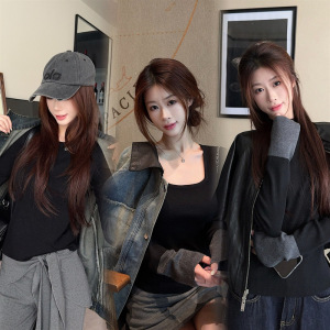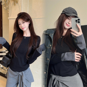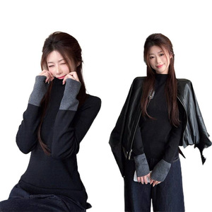 大码女装秋冬胖mm撞色长袖针织衫女修身打底衫上衣