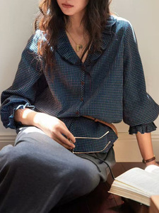 【 零点新品9折】solighter 法式复古V领荷叶边格子衬衫女秋季新